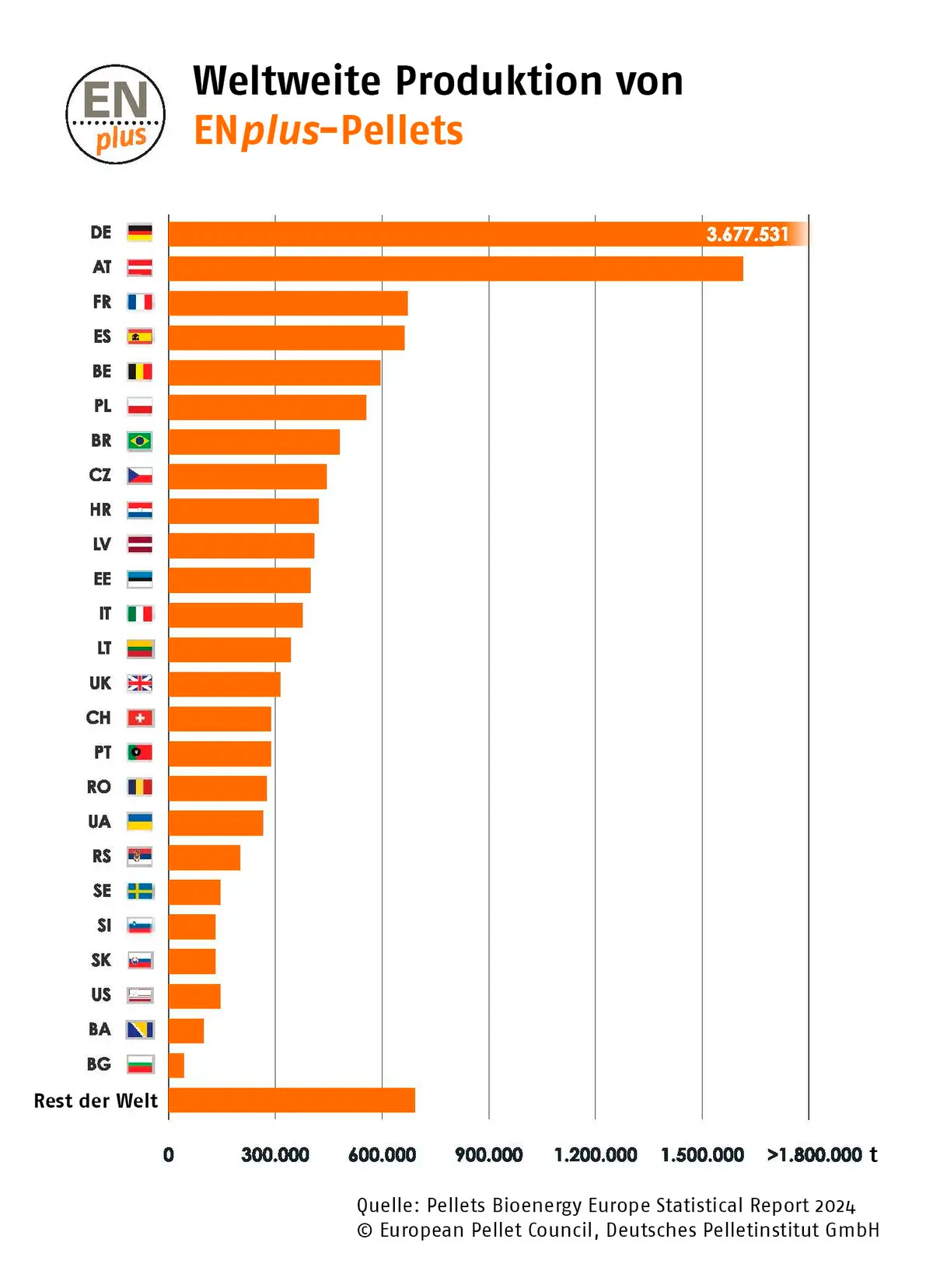Internationales ENplus-Siegel garantiert Brennstoffqualität. Deutschland steht weiterhin an der Spitze bei der Produktion des modernen und besonders hochwertigen Holzbrennstoffs, wie der jährlich erscheinende Pellet Report von Bioenergy Europe bestätigt: Rund 27 Prozent der in 2023 weltweit hergestellten zertifizierten ENplus-Pellets stammen aus der Bundesrepublik. Weltweit sind im Juni 2024 mehr als 1.200 Unternehmen ENplus-zertifiziert, davon allein 228 in Deutschland.